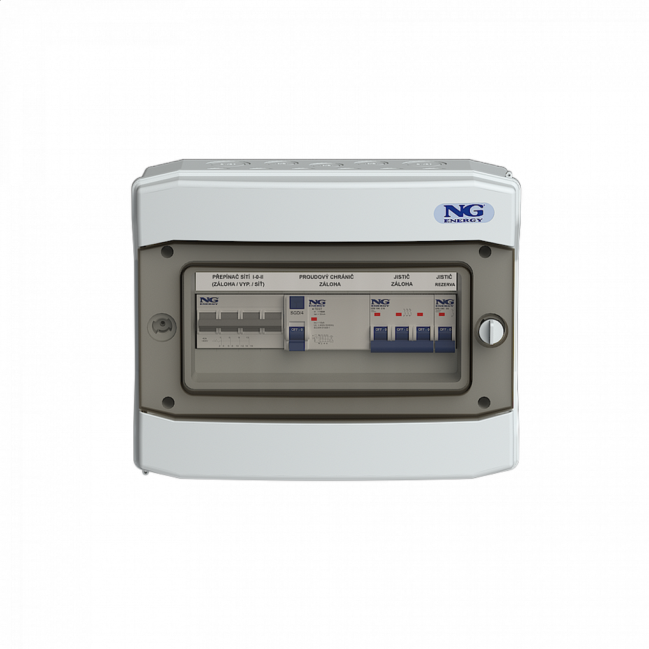 Komplexní ochrana (Q1): Všechny zálohované okruhy jsou chráněny společným čtyřpólovým proudovým chráničem (30 mA), což zajišťuje ochranu osob a majetku bez ohledu na aktuálně zvolený zdroj napájení.